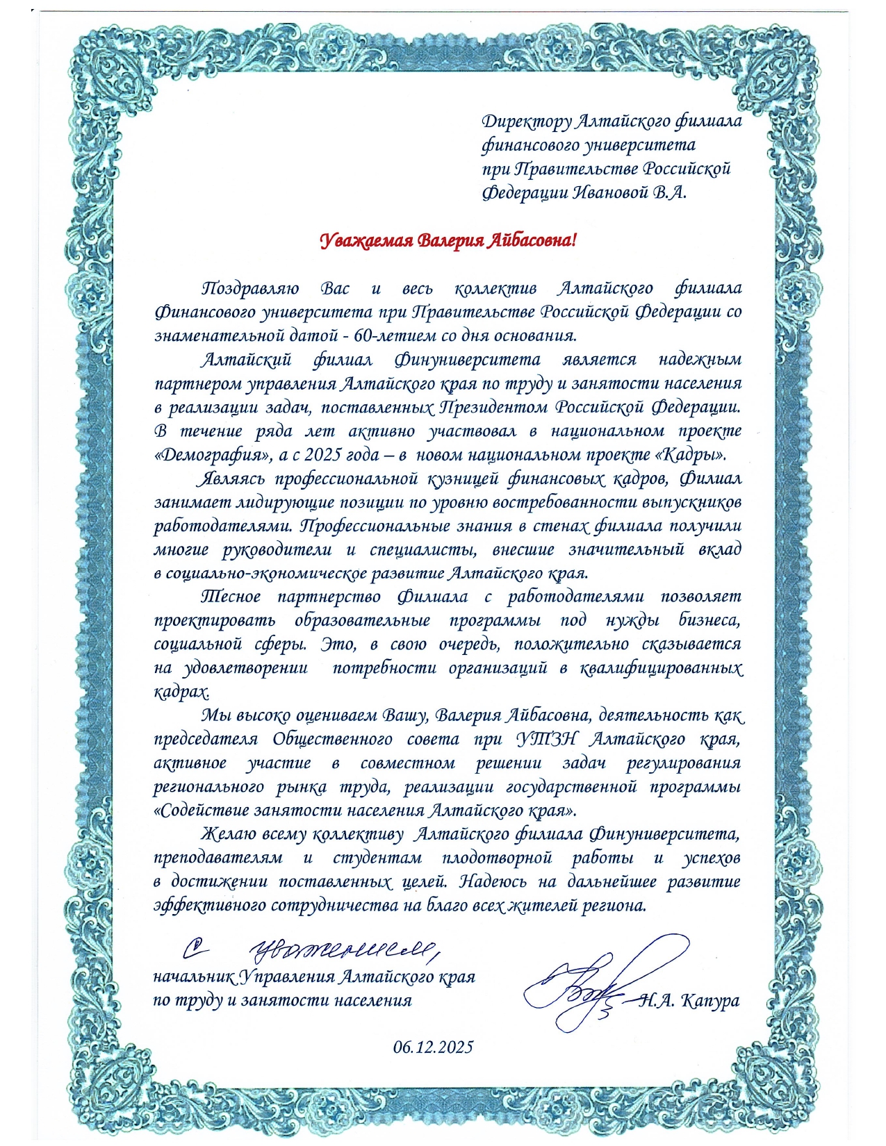 Благодарим Управление по труду и занятости населения Алтайского края за теплые слова и долголетнее плодотворное сотрудничество! Вместе мы создаем будущее кадрового потенциала региона.