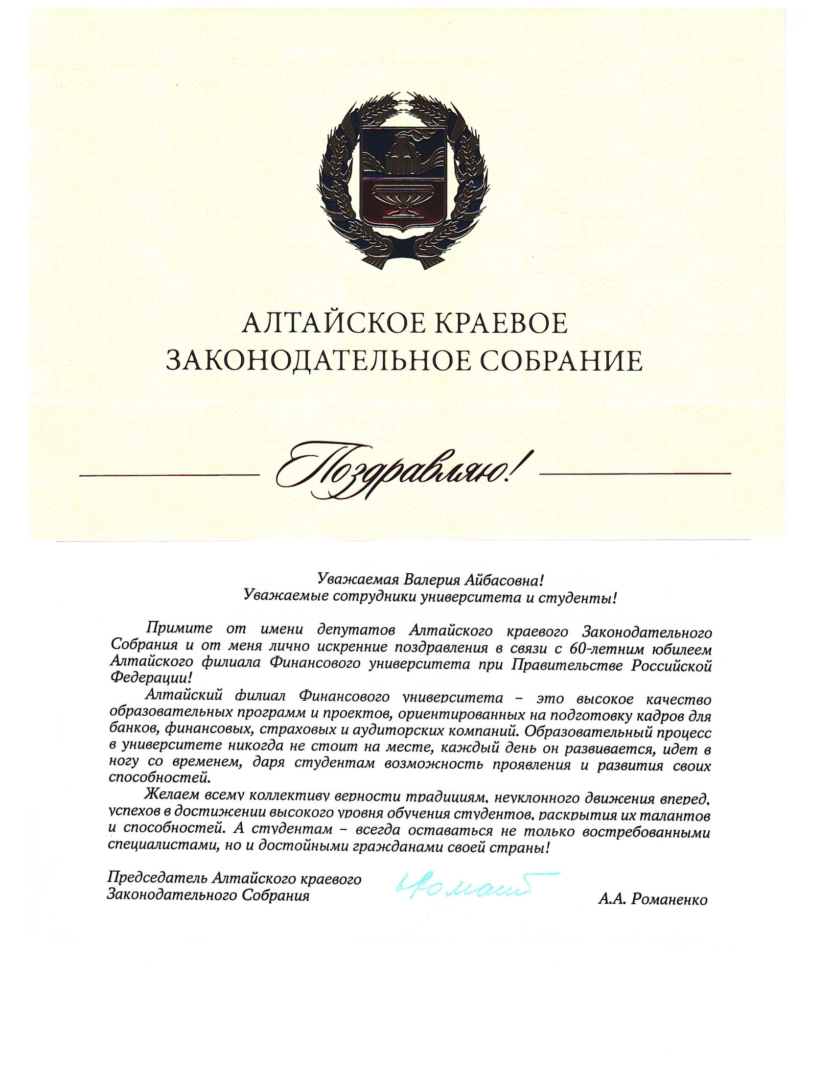 Примите от имени депутатов Алтайского краевого Законодательного Собрания и от меня лично искренние поздравления в связи с 60-летним юбилеем Алтайского филиала Финансового университета при Правительстве Российской Федерации!